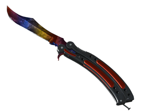 Це спеціально розроблений балісонг, також відомий як ніж-метелик. Визначальною характеристикою цієї зброї є легке розкриття вільного в обертанні леза віялоподібним рухом, що дозволяє швидко оголити та приховати лезо. Через це ножі-метелики заборонені законами багатьох країн. Нанесено зображення чорною і срібною фарбою під мармур, а потім вкрито градієнтом із трьох кольорів.