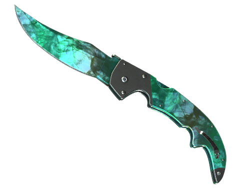 Цей ніж з оберненою кривизною обуха, сучасне переосмислення меча-фальшіона, має характерне загнуте вістря. Нанесено зображення чорною і срібною фарбою під мармур, а потім вкрито градієнтом.