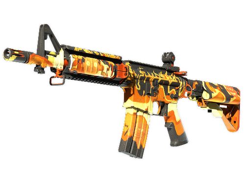 Точніший, але й слабший конкурент AK-47. М4А4 — це повністю автоматична штурмова гвинтівка, якою користуються спецпризначенці. На лискуче-чорну основу нанесено зображення помаранчевого та жовтого полум’я.