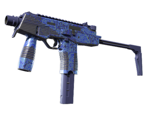 Вироблений у Швейцарії передовий пістолет-кулемет МП9 — це ергономічна полімерна зброя, яку полюбляють приватні охоронні фірми. Нанесено синій візерунок у вигляді крапель.