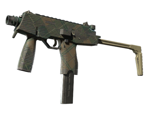 Вироблений у Швейцарії передовий пістолет-кулемет МП9 — це ергономічна полімерна зброя, яку полюбляють приватні охоронні фірми. Аквадруком нанесено сіро-брунатну текстуру із синьо-зеленими клітковими візерунками.