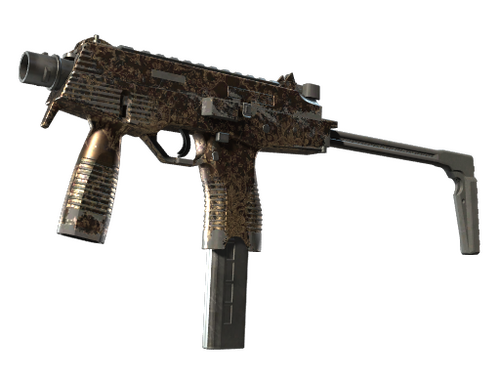 Вироблений у Швейцарії передовий пістолет-кулемет МП9 — це ергономічна полімерна зброя, яку полюбляють приватні охоронні фірми. Нанесено золотий дамастовий візерунок.