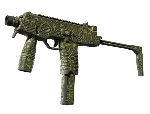 Вироблений у Швейцарії передовий пістолет-кулемет МП9 — це ергономічна полімерна зброя, яку полюбляють приватні охоронні фірми. Аерографом нанесено візерунок винограду і квітів у різних відтінках зеленого.