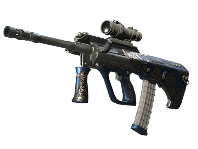 Потужна і точна гвинтівка з оптичним прицілом АУГ компенсує своє тривале перезаряджання низьким відхиленням куль та високою швидкістю стрільби. Срібну філігрань нанесено на блакитну анодовану основу.